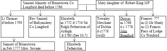 6. John, born c1740, merchant of Dublin, then in 1780 of Killincarriok, Co Wicklow, married firstly 27th November 1766 (ML) Dorcas, daughter of Samuel Ahmuty of Brianstown, Co Longford, and married secondly 1780 Mary Ann, widow of Mr Barrington, of Dublin. No known children.