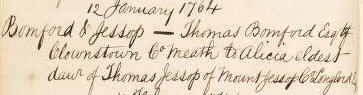The licence was issued by the Diocese of Dublin and reads “Bomford Thomas of Colounstown, Co Meath, Esqr, and Alice Jessop of the Parish of St Michan’s, Dublin, spinster. Directed to said parish 12th January 1764” (Page 443).