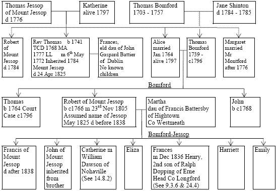 2. The Chancery answer of the Rev Thomas Jessop in the action of Thomas Bomford v Rev T Jessop. This is a long document, which is recorded in full below (14.9). It makes astounding reading but it is apparent that Mount Jessop was originally to be left to the elder son of Thomas and Alice Bomford, Thomas Bomford, but because of his actions he was disinherited and the place went to the second son, Robert Bomford. A number of others in the Jessop family are mentioned in the document and the tree below brings in all these so that a fuller picture can be built up.
