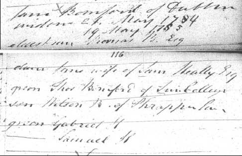 8. Jane (14.12.5), born c1744, married c 1st January 1770 Samuel Heally (14.4.1). He died before May 1784 and she after that date. There were two children, Gabriel and Samuel Heally.
