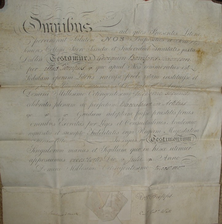 2. Benjamin Pratt, born 1669 at Garadice, BA (TCD) 1689, MA 1692, Fellow 1693, BD 1699, LL D 1702, Professor of Laws 1704, DD 1705, Provost of Trinity 1710, Dean of Down 1717. Married Lady Phillippa Hamilton, daughter of James 6th Earl of Abercorn. Doctor Benjamin inherited Cabra Castle but died without children on 6th December 1721 and Cabra passed to his brother.