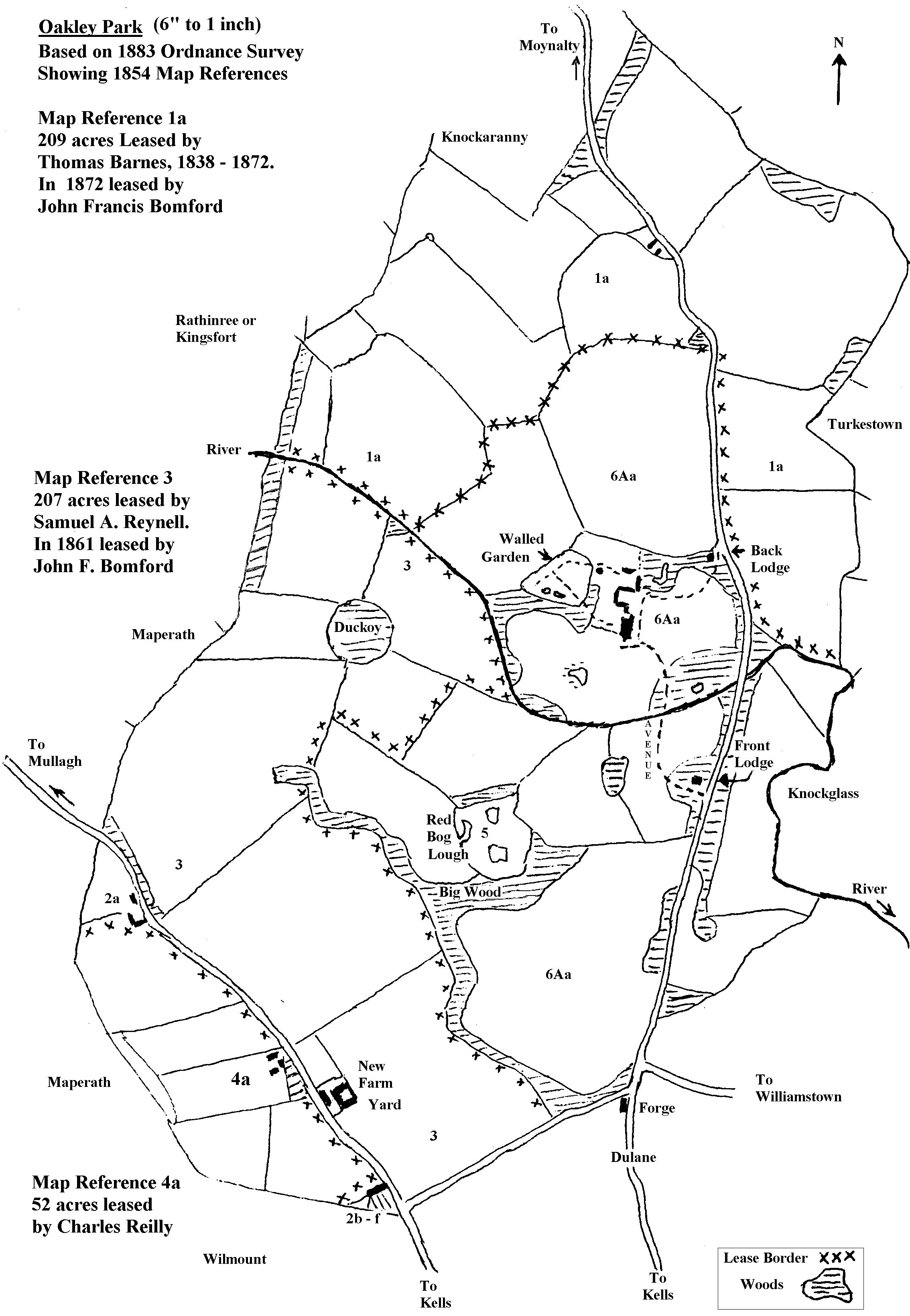 Map of Oakley Park or Lawrencetown, Based on 1883 Ordnance Survey showing 1854 Map References