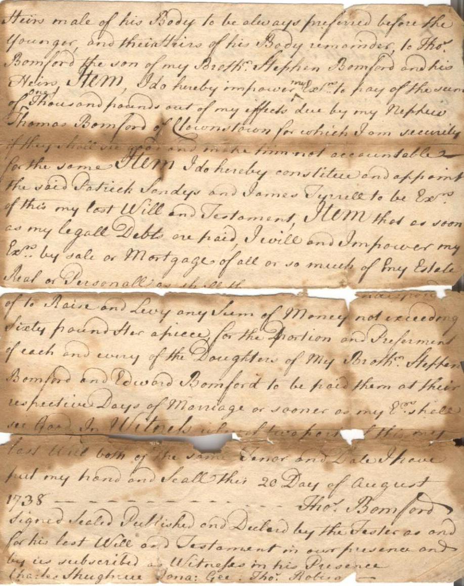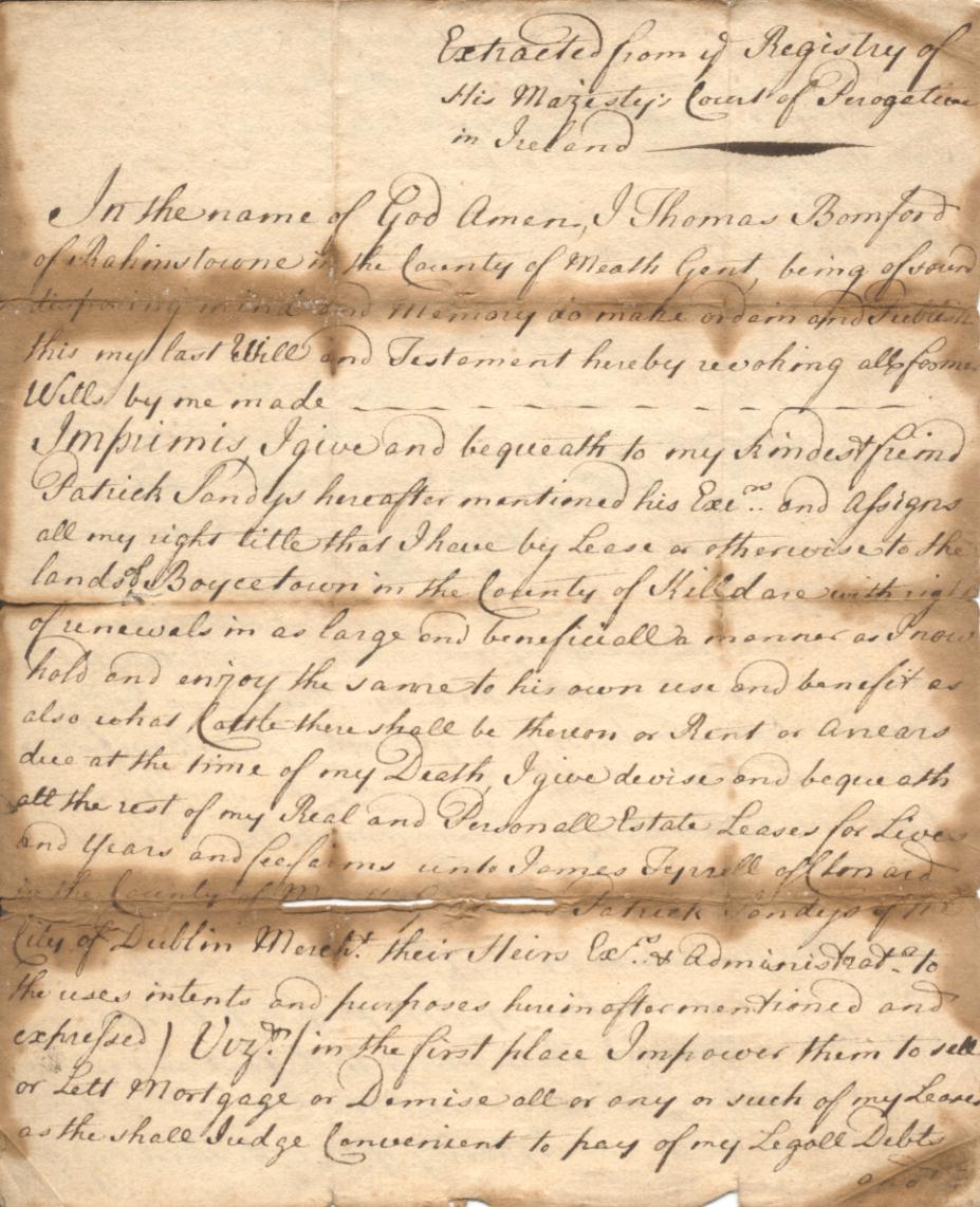 Copy of the Will of Thomas Bomford of Rahinstowne 20 August 1738, extracted from the Registry of His Majesty's Court of Perogative in Ireland. |