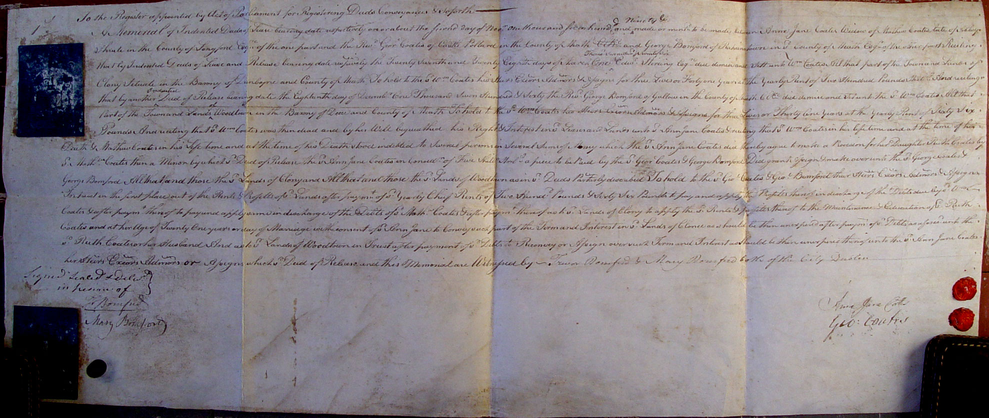Final Settlement of Drumlargan etc 11 July 1808. This indenture states that George Bomford is now the outright owner of Drumlargan and the other land, subject to an existing £5,000 mortgage. |