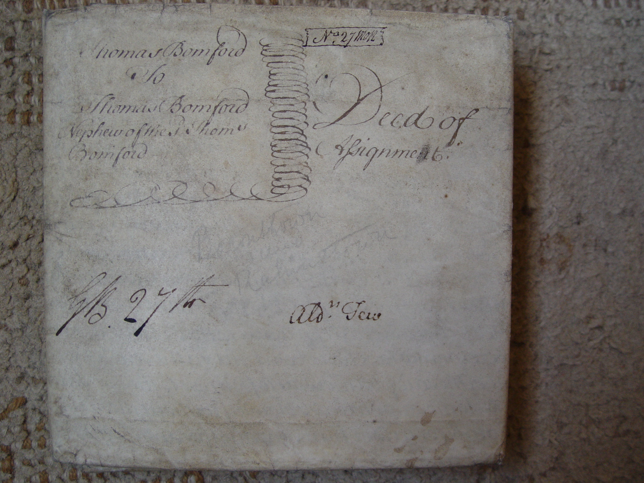On May 11 1733, Thomas Bomford, Edward Bomford and Thomas Bomford the younger took a bond on Jacob Pechell, since dead, for the penal sum of £4,000 for £2,000 with interest. This indenture of 21 October 1761 confirms that the bond is in the hands of Daniel Chenevix with the consent of Stephen Bomford. |