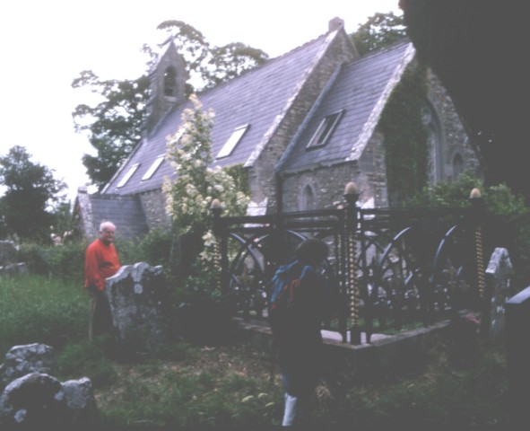 Photos: Above right, Peter Bamford in the churchyard at Laracor, 1996. Left below: the Bomford gravestone in Laracor churchyard. The brambles had been removed.