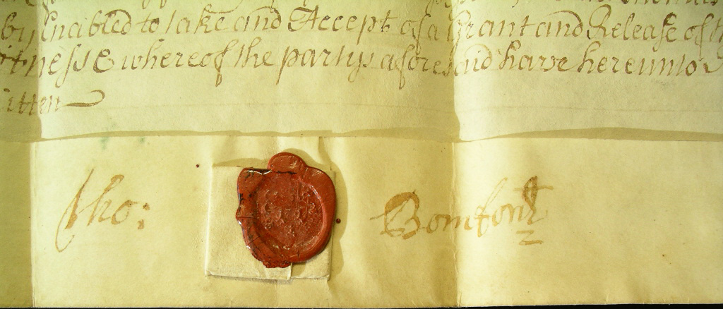 Leased by Thomas on 3 November 1703. Document D 16148 in the National Archives in Dublin is a typed transcript of a certified copy dated 1857 of a 1703 Indenture by which Isaac Holroyd, merchant of the City of Dublin, leased the towns and lands of Old Town Ferrans Fennars and little Ardrums, 407 acres plantation measure of profitable land plus bogs and commons, in fee farm forever to Thomas Bomford of Rahinstowne. The land was previously the property of Thomas Hussey 'attainted of the Treason' and forfeited to the Crown. Thomas had leased the lands for one year from the previous day (2 November 1703), for the nominal consideration of five shillings and a peppercorn rent (Document D 20035 in the National Archives in Dublin is the original counterpart deed with Thomas' signature and seal) which put Thomas in 'actual possession' of the lands sold.