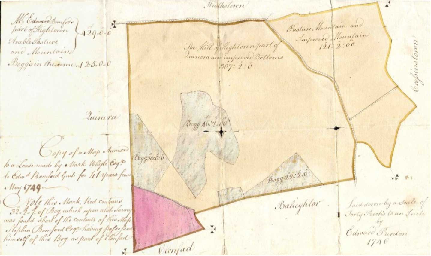 When Thomas died in 1740 (5.7), Hightown or Balloughter was sold to Mark Whyte to help pay off Thomas’ debts. Edward had lived at Hightown since about 1720 and he leased the land from Thomas. When the land was sold he leased it from Mark Whyte, but only 898 statute acres out of the original 1,011.