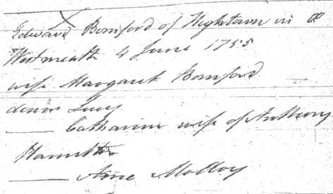 Were they perhaps unknown Bomford daughters who married or married again? It is not unknown at this time to omit the names of daughters or wives; for instance none of the daughters of Stephen the younger were mentioned in Burke, some have been discovered in this investigation, but there may be others. Is it possible, for instance, that Margaret Berwick (Bomford) married secondly Simon Nicholls (21 above) or could Elizabeth Hyland (5 above) have remarried and become Elizabeth Friend or Lennon?