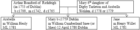 Arthur, the fourth child of Oliver, and Mary Bomford were living at Rathfeigh in 1742, the year of their marriage (7.15). They are next heard of in Dublin in 1753 and there they stayed. The following deed of 1767 gives a clue to Arthur’s death. Both Digby and his wife Mary Tarleton had to die and the deed produced, before 1767, so Arthur Bomford’s death would be about 1765.