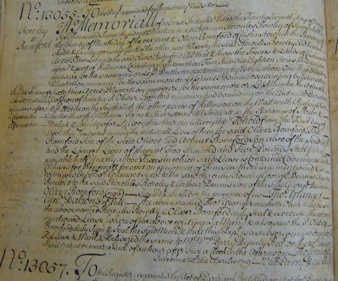 The following is extracted from the deed dated 10th August 1744 (6.5). In 1703 Isaac Holroide (a Dublin merchant who died in 1706) leased to Thomas Bomford of Rahinstown the town and lands of Oldtown, Ferrans and Little Ardrums containing 447 acres plantation measure (724 statute) fee farm for ever for a rent of £165 per annum and 10 guinea pieces of gold every 21 years. A transcript of the original lease has since been found in the National Archive in Dublin (document D 16148).