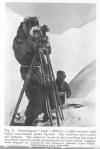 The normal wooden tripod was an awkward load to ski with; it travelled best tied vertically to a Bergen rucksack frame from which the rucksack had been removed. A rigid tripod is essential, and we are not prepared to recommend the use of a telescopic tripod without a trial. The aluminium cap shrank on to the brass tripod head in cold weather, and in the early days we often had the utmost difficulty in removing it. There is, however, an infallible remedy, involving the use of warm water, which the authors will be glad to pass on confidentially to those interested. One tripod leg broke near the top, but was repaired with a pen knife by shortening it three inches, which caused little inconvenience.