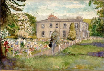 The avenue continued to the yard and to the back avenue along the east side of the house. The yard and the back of the house were sheltered by another wood so that coming up the avenue one only saw the front and side of the house on a slight rise and backed by trees. This wood ran between the flower knot and the big garden on the far side of the house, and so down to the river in what was called “the shrubbery”. As money became short the shrubbery was the first to suffer, the paths became overgrown and the shrubs and trees fought for light with many casualties; but it must have been a magnificent pleasure garden in its heyday. The back avenue was not used very often but it finally emerged through more woods in the lawn onto the main road. A similar set of wrought iron gates were there together with the back lodge where Ownie Lynch and his sister lived. Ownie looked after the carthorses and was the ploughman.