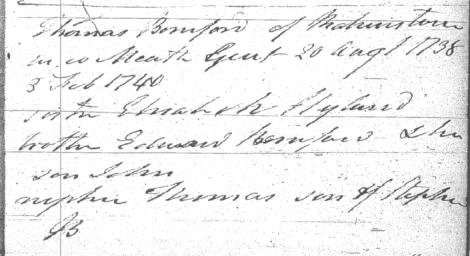 1. Thus Stephen’s son Thomas came into Rahinstown and Baconstown. It is this deed, which determines the birth date of Thomas since he would not have been permitted to sign the deed unless he was over 21, he must have been born before February 1717, and so it determines the marriage date of his parents as well, which has been placed as c1715. More recently it has been confirmed that Stephen was married in 1713.